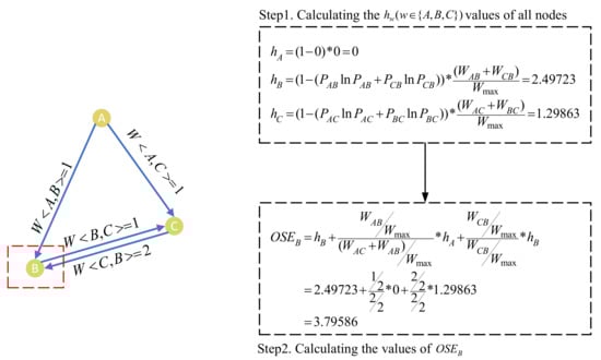 Figure 5 shows a simple example to exhibit how to calculate the OSE of nodes in a network. The left part of Figure 5 shows a , and the right part shows the process to calculate the value of node B as an example. First, we calculate the value of each edge in the CCN. We get and from the left part of Figure 5, and then take it into formula (1) to calculate In the same way, we get , and . Second, we calculate in the CCN by combining the weight edge distribution on the neighbour node. We take (∈ {A, B, C}) value into formula (2) to calculate the (w∈ {A, B, C}) value of each node in the , and we obtain , and (the detailed calculation process is demonstrated in Setp 1 of Figure 5). Finally, we normalize the h value of the neighbour node and combine it with the h value of this node to calculate the OSE value of the node. and are brought into formula (3) to calculate the value of , which is equal to (the detailed calculation process is demonstrated in Setp 2 of Figure 5).