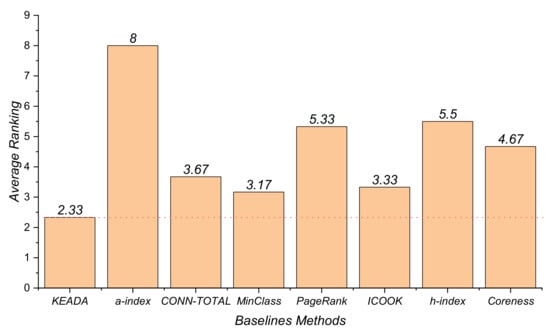 From the above experimental results, it can be found that different approaches perform differently on the three software systems. Thus, we were unable to find one that has the best performance across all the software systems. In this work, in order to compare the performance of the different approaches in all the software systems, we use the Friedman test. Figure 6 shows the results of the average ranking of the baseline approaches in terms of the Recall metric. The smaller the value is, the better the performance of the approach. The results in Figure 6 demonstrate that the average ranking of KEADA is smaller than that of the remaining seven approaches. Even though the MinClass also performs well, there is still a gap to our KEADA, as evidenced by the fact that the average ranking of the KEADA is lower than that of the MinClass. Therefore, our answer to the RQ is that our approach does perform better than other baseline approaches on the key class identification according to the results of the Friedman test.