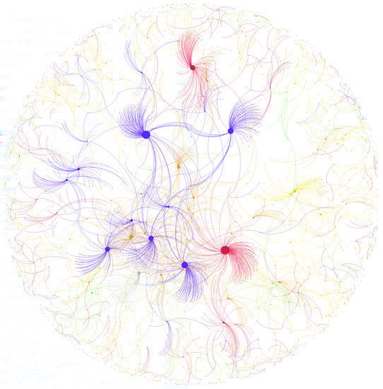 The formation and development of elites is a dynamic process; this status is constantly changing by quantifying the interactive behaviors []. Many research methods for selecting elites are too simple and rely on official verification [,,], and some users with “Big-V” may not be influential. User influence is essentially a reflection of interaction capabilities and therefore this paper targets the real elites through a lens of interactive networks. Weibo features a variety of interactive forms such as following, mentioning and retweeting. Needless to say, the frequency of being forwarded, through which tweets are disseminated in social media, is relatively more realistic and direct than the number of followers in reflecting user influence []. Moreover, the attributes in the Weibo data collected contain the retweeted status of original tweets and the corresponding author information; accordingly, a retweet network between users can be constructed by extracting their retweeting relationships. The retweet network can be represented by a directed weighted graph in which the nodes represent Weibo users (those without edges are omitted), the edges are the set of retweet relationships among users and the weight of the edge is the total number of occurrences of retweets between user pairs (in our sampling period). The larger the edge weight is, the more faithful the retweeter is to the original publisher. Accordingly, we built seven networks using the separate retweet data from the seven domains in our later explorations. Their degree distributions show the power–law trend with long tails (see Appendix A Figure A1), indicating the existence of a minority of elites with a large number of connections. Figure 1 shows a sampled snapshot of the military retweet network with an edge threshold larger than 10 retweets for better visualization. These constructed retweet networks provide decent preconditions for subsequent work, such as the selection of elites and the inference of the user influence indicators.