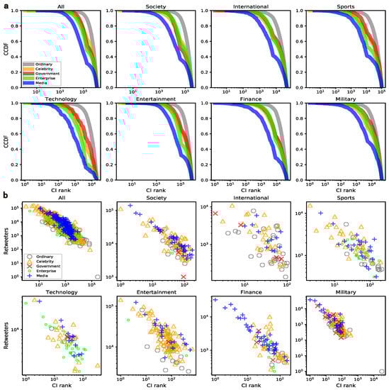where is the degree of node i and refers to the set of nodes in the ball of radius l centered on node i. Due to the uneven size of networks in various domains, we select the top users as elites from all users. Moreover, Appendix A Figure A2 and Figure A3 show the changes in influence scores (in-degree) of top-k users and their proportion of reachable nodes, respectively. To ensure sufficient user influence and collective communication effects, is set to 200. The CCDF (complementary cumulative distribution function) and scatter plots of the CI rankings for the mass and elites are demonstrated across domains in Figure 2. Note that the lower value of CI ranking represents more influence, and Figure 2b shows that both indicators are positively related, and elites selected from them are almost the same. According to in-degree, the distribution of elites in each group as = 200 can be found in Table 1, and a total of 930 unique elites are obtained from all domains. In addition, the influence changes of elites are more diversified, which is significantly different from that of the mass. For instance, enterprises dominate in technology, and celebrities are even more influential than media users in sports and entertainment. These differences between the mass and elites imply that user groups and content domains should be comprehensively considered, and the following experiments on behavior variations will be profiled and demonstrated at both levels of elites and mass.