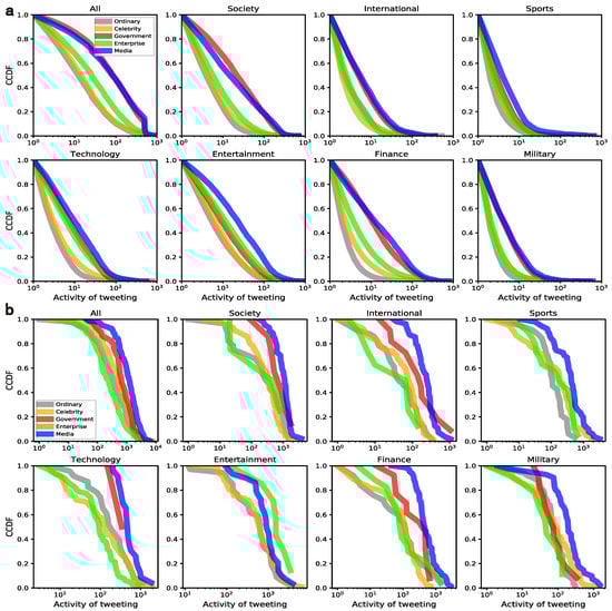As a key issue, many studies regarding the comparison between elites and the masses inherently neglected the behavior variations across user groups and content domains [,,]. In particular, various user groups, e.g., professions, might result in different behaviors in online social media []. Enterprises advertise products [] while athletic stars promote their popularity, and Zhao et al. [] divided users into four categories (i.e., engineer, recruiter, salesperson and manager) that fit for Linkedin to study their behavioral differences. Moreover, Smith et al. [] observed six different communication patterns in digital media, and contexts were also emphasized to feature different structures [,]. In understanding the behavior variation over multiple domains, it is also possible that elites may demonstrate patterns that differ from others. In this paper, to capture a complete picture, the behavior variation of elites across content domains and user groups is therefore separately discussed and compared with the case of all users, i.e., the mass level.