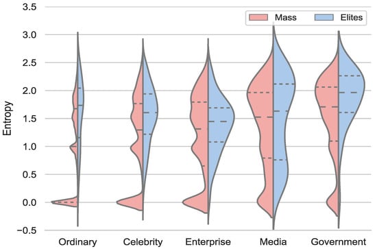 Regarding the theoretical implications, our study enriches the literature on the behavior analysis of the mass and elites in multiple domains. Although existing studies have described the great difference in role and influence between the mass and the elites in information diffusion [,,,], little attention has been paid to the changes across content domains and user groups. In this paper, we document direct evidence that there are significant differences between the mass and elites in various behavioral dimensions across user groups and domains. Specifically, we find that media users are mostly active, and the varying patterns of the mass and elites are quite different across domains. As for the entropy of tweeting, most elites have a wider variety of content than the mass, and they often use video links to tell stories vividly. In addition, only the homophily of enterprises is very low. Surprisingly, the average loyalty of the mass is higher than that of elites. This study extends the dimensions of the behavior comparison between the mass and the elites, contributing to the existing research on mass communication. In addition, to the best of our knowledge, this study takes the first step to explore the differences in popularity strategies between the mass and elites, which creates opportunities for marketers to design different strategies for users with different behavioral characteristics.