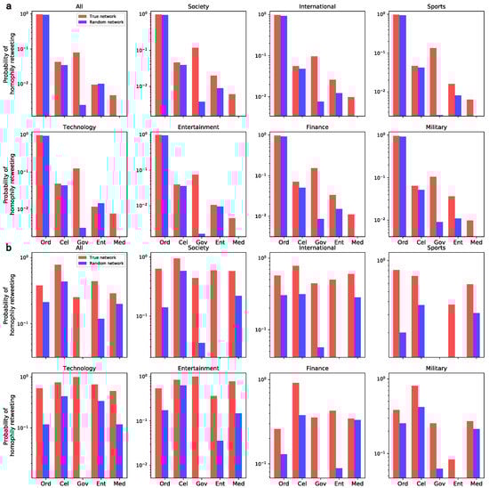 On the basis of the constructed forwarding network, we measure the retweeting homophily through the probability of edges connecting a pair of users with the same verified type (regardless of the edge weights). At the same time, we also calculate this indicator in the random network in which all edges are randomly rewired as a benchmark to test its significance. The comparison of the homophily between the real network and its random counterpart in each domain is shown in Figure 6. The homophily of the government and media users is significantly higher than that in the random counterparts, indicating their inclination toward homogeneous retweeting. The group of ordinary users also possess a high homophily because they account for 95% of the nodes in the network, and accordingly, their random homophily is similarly high, meaning a low significance. The enterprise’s homophily is even lower than the random value in the technology domain. In fact, a large part of the corporate accounts come from the emerging Internet technologies and these accounts seldom interact with other enterprises due to their competitive relationship, unless they have an interest-based partnership. Nonetheless, the homophily of elites in enterprise is always higher than the corresponding random value, which indicates that the enterprise elites can interact freely without restrictions.