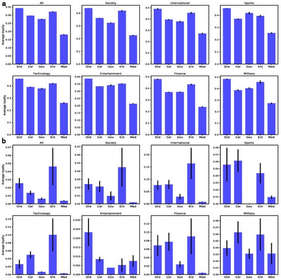 Average loyalty of retweeters across domains and user groups. Note that sub-graphs (a,b) represent the mass level and the elite level, respectively.