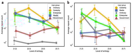 In order to explore how content diversity affects retweets, we divide the individual posting entropy into several levels. Specifically, the entropy is 0 when the user only posts in one domain, 1 represents posting in two domains on average, 1.585 refers to three domains and so on. Considering that the richer the content is, the fewer the number of users there are, the grouping of users is divided into “[1, 2)”, “[2, 3)”, “[3, 5)” and “[5, 7]”, according to the corresponding entropy values of “[0, 1)”, “[1, 1.585)”, “[1.585, 2.32)” and “[2.32, 2.807]”. The average repost count and error bar of each group at the mass and elite levels are shown in Figure 8, respectively.