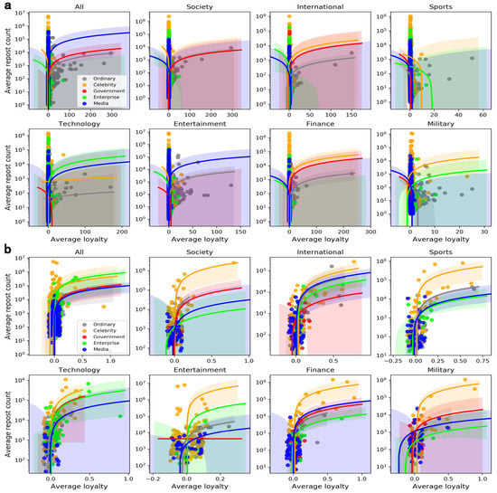 The relationship between the loyalty and the average repost count across user groups and domains. Note that sub-graphs (a,b) represent the mass level and the elite level, respectively.