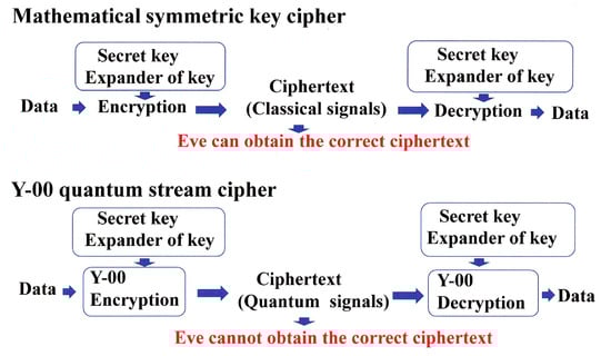 At first, we introduce a comment on a general view of cryptography in our research project. In the recent book [1] and a technical paper [2], S. Tsujii, who is one of the leaders of the cyber security community and industry, explains the current situation of the cyber security community and industry on the current trend of the security technology, as follows. “Quantum computer capable of breaking public key cryptographies, such as RSA or elliptic curve cryptography, that relies on mathematical decipherability due to prime number factorization or discrete logarithm problems, will not be developed within 20 years. Nevertheless, the jeopardy due to the cooperative effect with the development of mathematics remains. Thus, NIST is in the process of selecting candidates for quantum computer-resistant cryptography. The applications of cryptography for confidentiality are categorized into the confidential transmission of data itself and the key delivery or storage for that purpose. Then from the viewpoint of academic methods, they are categorized into mathematical cryptography and quantum cryptography. In the former case, there are two types such as public key cryptography and symmetric key cipher. Public key cryptography has the advantage of securely delivering and storing the initial key for data encryption and transmission. However, its processing speed is slow, so symmetric key cipher is responsible for data encryption. On the other hand, quantum cryptography is a cryptographic technique that uses quantum phenomena to improve security performance. The technique that uses quantum communication to perform the key delivery function of public key cryptography is quantum key distribution (QKD: BB-84 et al.), while the technique that uses quantum communication to perform the cryptographic transmission of data itself is called Y-00 quantum stream cipher (see Figure 1). QKD cannot be used to supply keys to One Time Pad cipher, because its data rate is too slow. Y-00 for data encryption is extremely novel in its ability to prevent eavesdroppers from obtaining the ciphertext of the symmetric key cipher. In addition, it is amazing that the strong quantum-ness is created by modulation scheme with multi-ary coherent state signals without any quantum device”.
