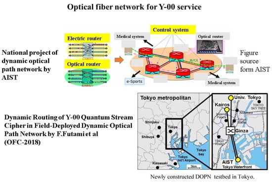 Large amounts of important data are instantaneously exchanged on the communication lines between data centers where various data are accumulated. It is important from the viewpoint of system protection to eliminate the risk that the data are copied in their entirety from the communication channel. We believe that the Y-00 quantum stream cipher is the best technology for this purpose (see Figure 4). On the other hand, this technology can be used for optical amplifier relay system. Hence, it can apply to the current optical communication systems. Transceivers capable of cryptographic transmission at speeds from one Gbit/s to 10 Gbit/s have already been realized, and by wavelength division multiplexing, a 100 Gbit/s system has been tested. Furthermore, communication distances of 1000 km–10,000 km have been demonstrated. In offline experiments, 10 Tbit/s has been demonstrated. In general, a dedicated line such as dark fiber is required. If we want to apply this technology to network function, then we need the optical switching technology developed by the National Institute of Advanced Industrial Science and Technology (AIST). Thus, in collaboration with AIST and other organizations, we have successfully demonstrated the feasibility of using the Y-00 transceiver in testbed optical switching systems (see Figure 5). Furthermore, Figure 6 shows the recent activities of the experimental research group at Tamagawa University towards practical application to the real world [22,23,24,25,26,27,28,29].