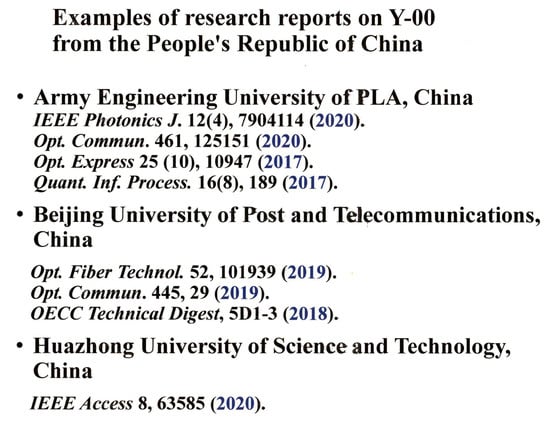 On the other hand, the Y-00 quantum stream cipher is a technology that can realize the specification of high speed and long communication distance. In addition, the signals of Y-00 cipher with ultra-multiple-valued scheme for coherent state signal, so called quantum modulation, can have stronger quantum properties than QKD in the sense of quantum detection theory. So, the security is protected by many quantum no-go theorems (Appendix C). Although it is difficult to make an accurate prediction, there is a good chance that such a new technology will be used in the future. In view of the situation described in this paper, the Y-00 quantum stream cipher will contribute to real-world applications of quantum technology for Society 5.0, and new business development can be expected. Finally, we would like to note that Chinese research institutes have recently been actively working on Y-00 quantum stream cipher. Figure 7 shows a list of academic papers on their activities [32,33,34,35,36,37,38,39]. It is expected that many research institutes will participate in this technological development.
