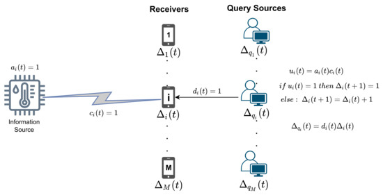 In the system model, there are also query sources linked to each receiver. Each query source is independent of the other, and used to model the behavior of a real-life user or application interested in a particular time-sensitive piece of information at query instants. Query arrival frames to receivers can follow either a deterministic or stochastic pattern. When a query source requests information from a receiver, it sends a query. Then, the receiver responds to it with the latest information that the receiver holds. Query and response messages are transmitted without any errors.