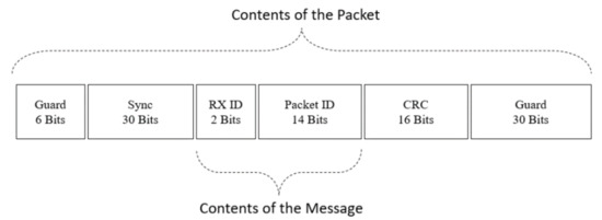 The message field contains time-sensitive information. The message consists of Receiver ID (RX ID) and Packet ID fields. RX ID field is a 4-bit address that is used to distinguish receivers. Each receiver has a unique RX ID. When a receiver obtains a packet, it locates the RX ID field in the packet content and compares it with its RX ID. If the RX ID of the packet and the receiver do not match, the receiver discards the packet, and for that receiver increases by one for the next frame.