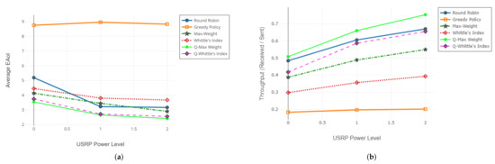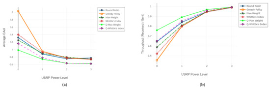 We evaluate the scheduling policies under various conditions by changing the channel reliabilities of the receivers among experiments. To change channel reliabilities, we manipulate the gains of the receiver and transmitter USRPs. LabVIEW allows configuring the signal gains of USRPs. Moreover, we locate receiver USRPs with different distances to the transmitter USRP to induce diverse path losses to receiver USRPs. When the signal power of the transmitter USRP increases, all receivers in the network acquire stronger signals. Therefore, the channel reliabilities of all receivers increase. Throughout the experiments, we also adjust the power gains of the receivers to alter the channel reliabilities. The receiver’s power gain is directly proportional to its channel reliability. Increasing the signal gain of a receiver reduces the error probability for that receiver and increases the channel reliability.