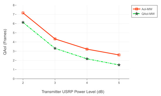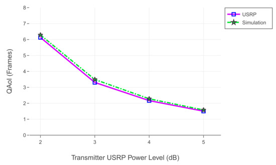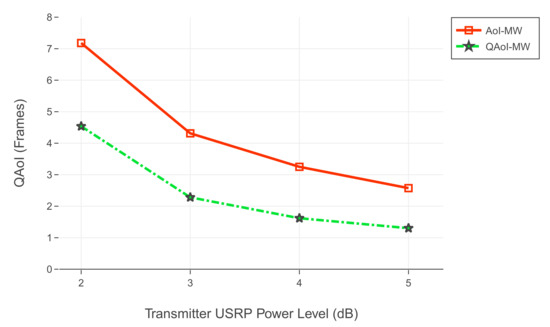 In this section, we share the results of our experiments. We conducted the experiments in the simulation environment and the SDR environment. Throughout the experiments, we evaluated the performance of the QAoI-aware MW policy in terms of QAoI and AoI, and we used the AoI-aware MW policy as a benchmark.