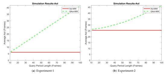 Query age of information (QAoI) is a recent semantic metric proposed to investigate pull-based scenarios from the AoI perspective [27,28,29,30]. QAoI considers a model where the freshness of information is valuable only at query moments. These queries are sent to the receiver modules in the network. Then, the receiver modules respond to these queries with the most up-to-date information. The source of the queries can be a user or an application that needs to obtain the most up-to-date information. In [29], the pull-based scenario is discussed, and the effective age of information (EAoI) metric is presented for the multi-user system model. Query generation is modeled as an independent Bernoulli process for each receiver, and the immediate EAoI is assumed to be zero for frames without queries. For the queried frames, immediate EAoI is related to the immediate AoI of the receiver under the proactive serving assumption as a query response procedure. According to the proactive serving method, the receiver module can wait for the query response for a frame if it is expecting a packet arrival within the frame. If a packet arrives at the end of the frame, the receiver sends the information in the newly received packet as a query response. In the study, WI-based scheduling policy is proposed for the multi-user system model, and the performance of the policy is demonstrated in the simulation environment.