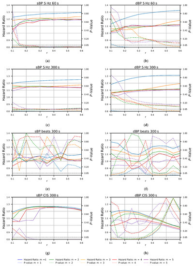 Plots showing the hazard ratios and p-values from bivariate Cox proportional hazards regression models investigating associations between sample entropy (SampEn) calculated from time-domain (5 Hz, 60 s and 300 s; a–d), beat-domain (e,f), and cardiac interval series (CIS; g,h) systolic blood pressure (sBP) and diastolic blood pressure (dBP) data and seven-year all-cause mortality, across a range of m and r values.