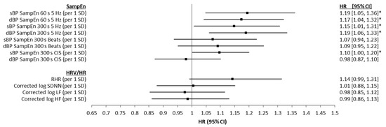 Forest plots showing associations between systolic blood pressure (sBP) and diastolic blood pressure (dBP) sample entropy (SampEn) (for 60 s and 300 s of data, both time-domain and beat-domain), as well as SampEn of cardiac interval series (CIS), resting heart rate (RHR), corrected log of the standard deviation of NN intervals (SDNN), corrected log of low frequency power (LF, 0.04–0.15 Hz), corrected log of high frequency power (HF, 0.15–0.4 Hz) and seven-year all-cause mortality, using fully adjusted Cox proportional hazards regression models. Results are presented as z-scored hazard ratios (HR) with 95% CIs for comparability. All models are fully controlled for the variables outlined in Section 2.6 of the Methods. * p ≤ 0.05.