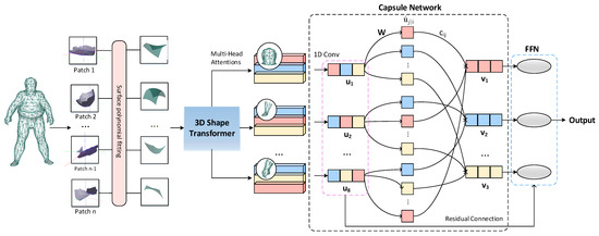 For a typical 3D data set d = 3, but in order to reflect the connection information of the mesh surface, we add the approximate geodesic distance so that d = 4. Similar to two-dimensional vision Transformer, we use the surface mesh transformer network proposed in this paper to extract local surface shape features. We use the local shape patches sampled on the model surface as the input set, namely Q. In theory, Q and K come from the same input. In order to reduce the computational cost, we perform unsupervised clustering on the surface of the local window to obtain a typical shape patch, which is regarded as K. In fact, the essence of Q and K is the same; we set the number of typical shape patches to C. We realize the attention calculation by measuring the similarity between the local surface window and the typical local shape. Then, we introduce a multi-head shape attention mechanism to expand the possibility of combination between the underlying local shapes and make the local combination information learned by the model more accurate. In order to diversify the learning as suggested by capsule networks, we feed these feature maps which describe shape information into a point-wise multi-layer perceptron with different weights, each with a distinct summary of the input shape with diversified attention. We then maxpool their responses to obtain a global latent representation. These descriptors are then concatenated into a set of vectors named primary capsules. We then use the dynamic routing to embed the primary capsules into higher level latent capsules. Each capsule is independent and can be considered as a cluster centroid (codeword) of the primary capsules.