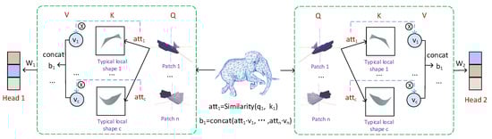 In the design of the shape Transformer in this article, we respect the standard self-attention mechanism to the greatest extent [5]. We also designed sequences in our method. Essentially, should also represent the shape token as input. However, in order to reduce the space and time complexity, we define as the initial local patch (ie shape token), as the simplified local patch (i.e., typical shape token), and as the feature value of the local patch. For the 3D mesh model without texture, we set the value of V to 1. The specific shape attention mechanism can refer to Figure 3.
