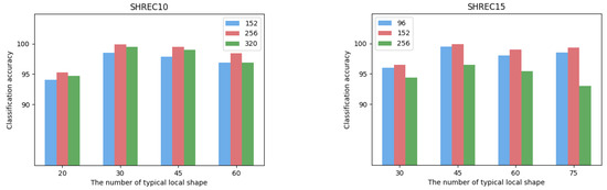 The size of the local shape is defined as the size of the local area centered on each vertex of the 3D mesh model, and its value will affect the feature extraction of the object. Based on the mesh densities of different datasets, we set the size of local shapes on the SHREC10 dataset to be 152, 256, 320 for ablation analysis. The sizes of local shapes on the SHREC15 dataset are set to 96, 152, 256. The comparison of the classification results obtained under different sizes of parts is shown in Figure 4. It can be seen from the figure that in the dataset SHREC10, the local shape size value of 256 has the best experimental performance. In the dataset SHREC15, the local shape size value of 152 has the best experimental performance. We believe that too small local shapes are difficult to describe more complex surface changes, and too large local shapes will lead to overly complex shape descriptions, resulting in learning difficulties. In addition, the grid density results in different local shape sizes in different datasets.