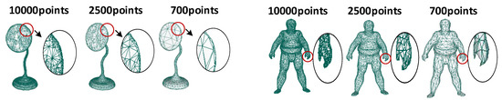 In the experiment, we used the classic quadric error metrics (QEM) algorithm [45] to simplify the mesh model. This mesh simplification method can effectively reduce the number of vertices of the complex mesh while retaining the topological characteristics of the original mesh and can customize the reduced number of vertices. The above two advantages can ensure that our model is simplified to the same vertex order, and the topological shape is kept unchanged, which provides convenience for our comparative experiments. The simplified result is shown in Figure 5.