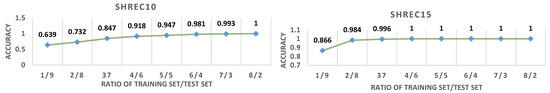 In order to verify that our method can still have good robustness under a small sample data set, we continuously reduce the proportion of the training set and observe its corresponding accuracy. We compare the SHREC10 and SHREC15 data sets when the ratios of the training set to the test set are 1/9, 2/8, 3/7, 4/6, 5/5, 6/4, 7/3, and 8/2.