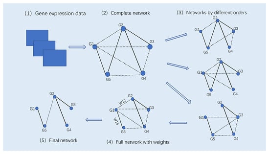 The diagram of SPCA. (1) The omics dataset with n genes and m observations. (2) The complete network in which each pair of genes are connected. The solid and dash lines in the network represent direct and indirect regulations, respectively. (3) A number of networks are inferred by using the PCA-PMI algorithm (Algorithm 1) based on the generated different variable orders. (4) Calculate the weight of each edge in the complete network based on the corresponding PMI values in all inferred networks in Step (3). (5) Select edges with the largest values of PMI measures to form the inferred network.