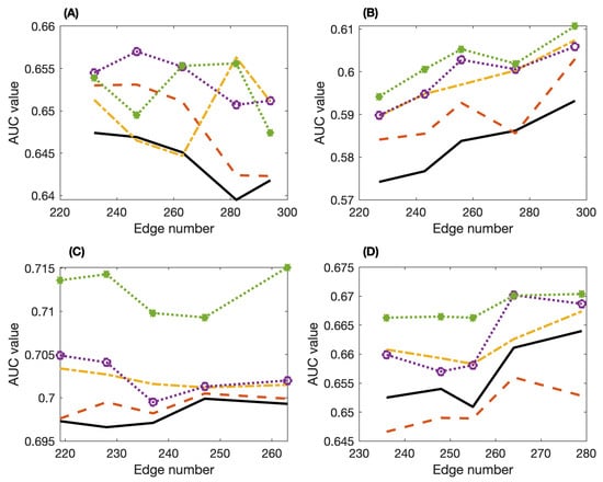 Values of the area under ROC curve (AUC) of the inferred networks for datasets from the DREAM4 challenge by using the PCA-PMI algorithm, PC-stable algorithm with PMI and our proposed SPCA algorithm. (A) Dataset 1; (B) dataset 2; (C) dataset 3; (D) dataset 4. (PCA-PMI: solid-line, PC-stable-PMI: dash line, SPCA with mean weight (3): dash-dot line, SPCA with average PMI (4): circle, SPCA with maximal PMI (5): star).