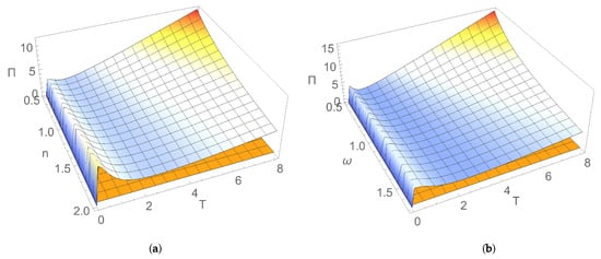 (a) Entropy production rate for an initial symmetric squeezed thermal state with resonant modes versus: (a) average thermal photon number n and temperature T, for frequency ; (b) frequency and temperature T, for the average thermal photon number . In both graphs one sets squeezing and dissipation .