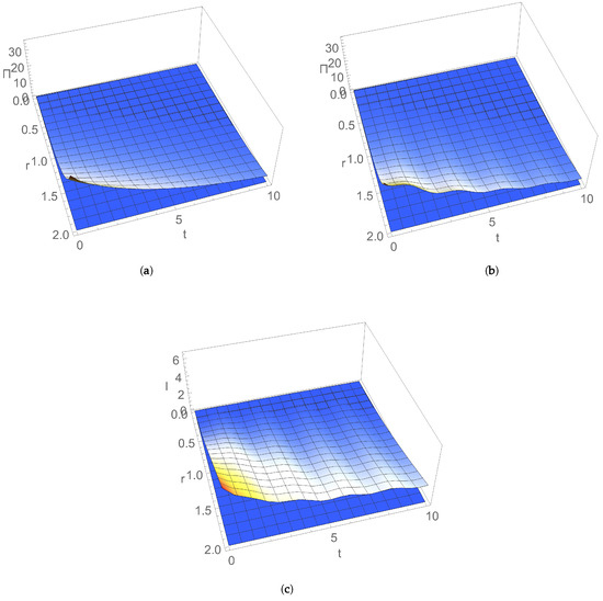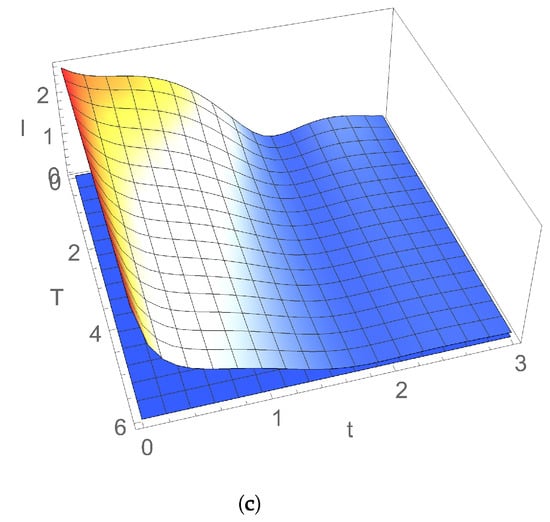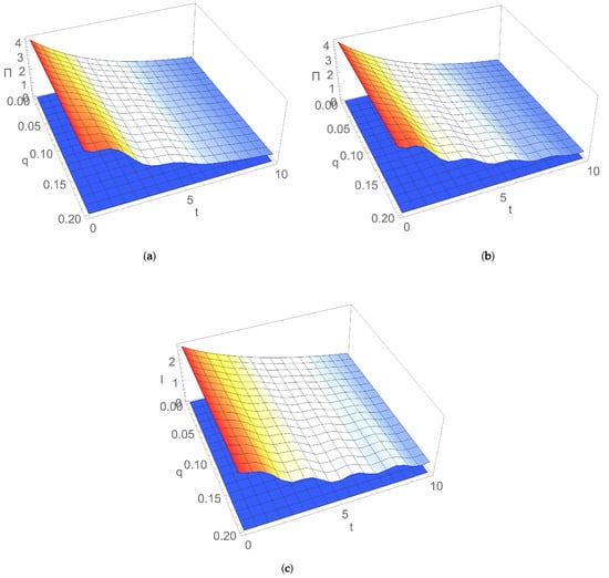 The time evolution of mutual information as a function of the coupling between two bosonic modes is illustrated in Figure 6c and Figure 7c. It increased with coupling q between modes, as expected. Similar behaviour relative to was observed. Therefore, the stronger correlations between modes are, the more irreversible the corresponding evolution and stationary process are. The coupling between modes is crucial to EP rate in the stationary state; for zero coupling between modes in the stationary state, when the system is actually in thermal equilibrium with the environment. The same result is valid for mutual information, which tends asymptotically to zero for large times. In contrast, for nonzero coupling between modes, EP rate and mutual information asymptotically tend with time to a nonzero value in nonequilibrium stationary state.