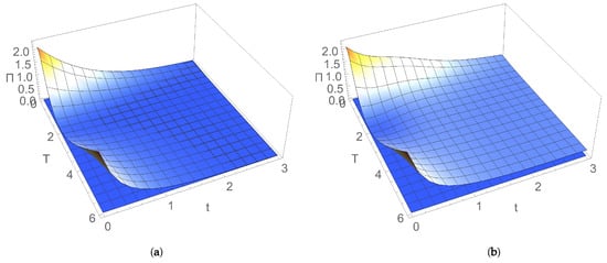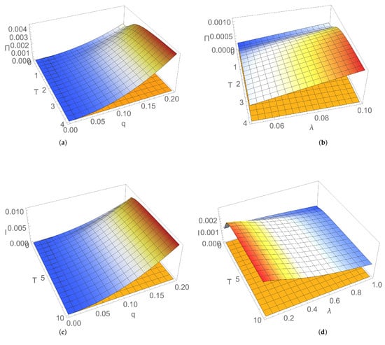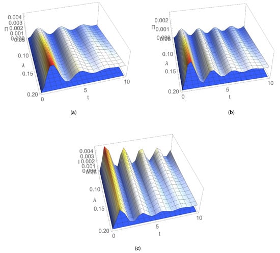 The time evolution of EP rate as a function of the coupling between the two bosonic modes, in cases of resonant and nonresonant modes, is shown in Figure 6a,b for an initial symmetric squeezed thermal state and in Figure 7a,b for an initial coherent state. The values of working parameters were chosen in agreement with the Markovian condition of weak coupling of the system to the environment and with stability condition . Under these assumptions, is increasing with coupling q between modes. Therefore, the stronger the coupling between modes is, the more irreversible the corresponding stationary process is. Coupling between modes is crucial relative to EP rate in the stationary state. Indeed, for zero coupling between modes, EP rate is zero in stationary state, when the system is actually in thermal equilibrium with the reservoir. For nonzero coupling between modes, on the other hand, asymptotically tends with time to a nonzero value in the nonequilibrium stationary state. From the above, it follows that, depending on the considered parameters, the time evolution of EP is monotonous and may also present oscillations that are relatively denser and more intense in the case on nonresonant modes compared to the resonant case.