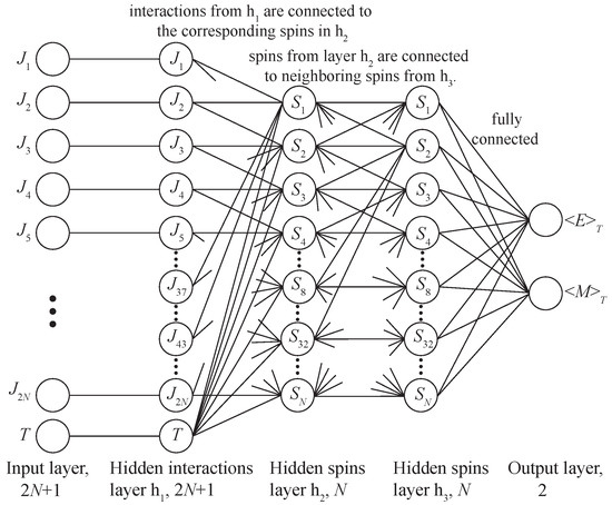 In total, two datasets each were calculated for two system sizes. The datasets contained values of all interactions J, one value of temperature T and two output values of mean energy and mean magnetization , therefore, a total of values. For the spin glass model with number of spins, the small dataset consisted of 834 configurations (with dimension of 50,040 × 75 since each spin glass configuration was calculated at 60 different temperature values) and the large one consisted of 41,405 configurations (2,484,300 × 75). For the model with number of spins, the small dataset consisted of 10,302 configurations (618,120 × 203) and the large of 43,596 configurations (2,615,760 × 203).