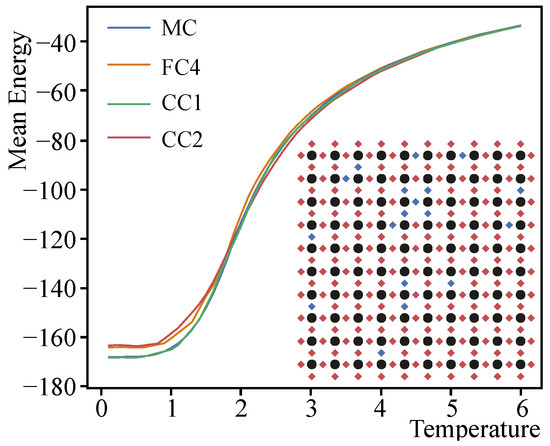 Example of average energy calculation using replica-exchange MC as well as neural networks of different architectures (FC4, CC1 and CC2). The configuration of the calculated spin glass is shown in the lower right corner of the figure. Black circles denote spins, red rhombuses denote bonds, and blue bonds.