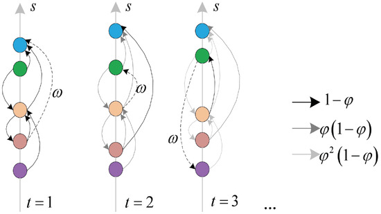 Figure 1 is a schematic diagram of the dynamics of our model, reflecting the relative change in rank at different nodes over a time horizon. The horizontal axis t represents the moment change, and the vertical axis s represents the rank score; the higher the score rank will be on the vertical axis. The dashed line represents the new support relationship at time t, and the solid line represents the pre-existing support relationship in the system. The lighter the color, the less important the relationship is and the more likely it is to be “forgotten”. At t = 1, the model is initialized and the support received by different individuals is recorded in the network adjacency matrix . The scoring function takes the adjacency matrix as input and the score vector s as output. A new support relation is then obtained according to expression (5), and this new relationship is weighted by and combined with the previous support relation weighted by . As time changes, this process is repeated, and the new support relations in the network gradually replace the old support in the system and update the score vector s. It can be observed that most of the support is a “short” leap, which is a pervasive pattern in most network data.
