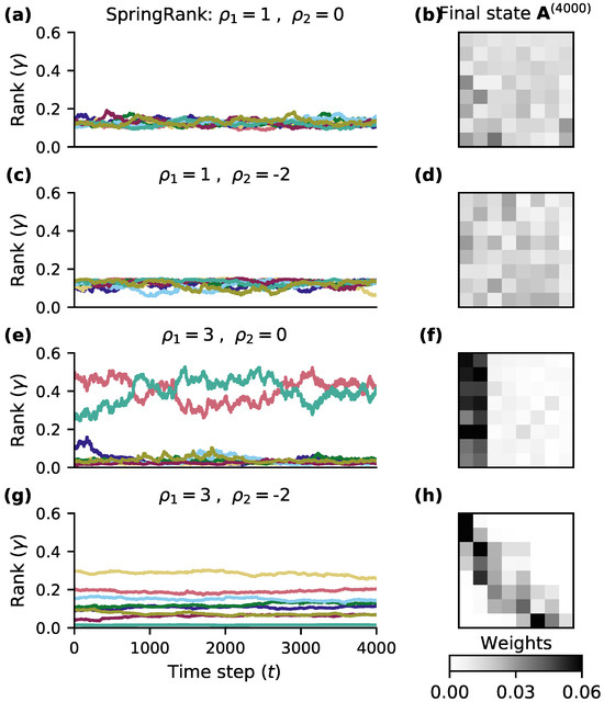 Figure 2 shows the rank variation of the dynamics with different parameters when using the SpringRank score function. The left side of the figure shows the variation of rank vectors for different and , and different colors indicate the rank of different nodes. The right side shows the adjacency matrix at t = 4000. It can be seen from subplots (c) and (g) that the hierarchical differentiation is more obvious in subplot (g). When is small, the system as a whole is approximately egalitarian, and for larger , there is a more clear hierarchical structure. However, the network system is elastic, and later we will find the critical value of that brings a huge change to the network hierarchy evolution under different score functions. In addition, the impact of is more reflected in the stability of node ranking, as can be seen from Figure 2e,g that smaller can reduce the fluctuation brought by the rank evolution in the network, making the network state smoother.