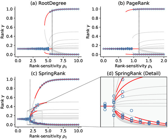 The bifurcation of the SpringRank, PageRank, and Rootdegree score functions model with and update per time step. Points give the values of the rank vector averaged over the last 1000 time steps of the -steps simulation with nodes. The solid line indicates the separation of the nodes into two groups by numerically solving the equation , the red curve indicates linear stability and the gray curve indicates linear instability. According to Theorem 1, the vertical line gives the critical value . The parameters , , = 0.995, = , = .