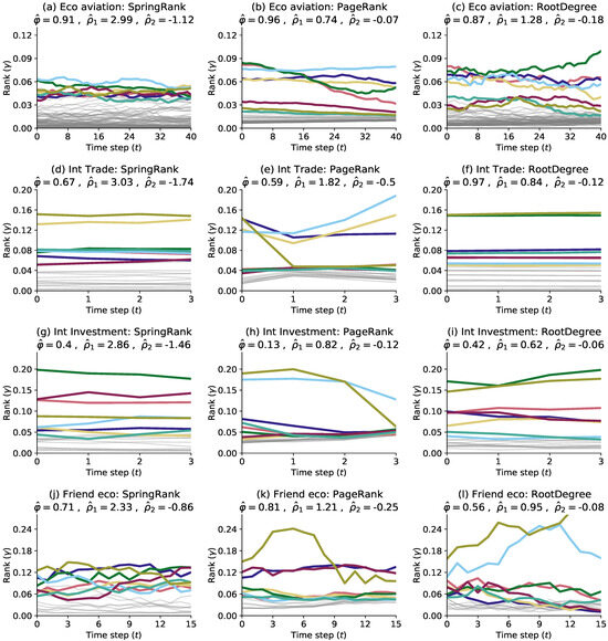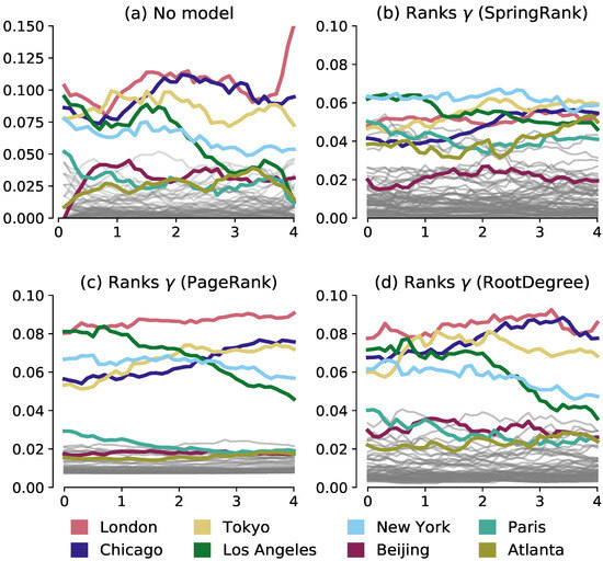 Different data have different best-fit scoring functions, while different scoring functions lead to different network rank evolution states. As shown in Figure 4, the original data assignment (Figure 4a) and the RootDegree model (Figure 4d) show strong consistency in the urban economic airline network, with most of the airline routes being in the higher-ranked economic cities. The PageRank and RootDegree models (Figure 5c,d) produce smoother ranking trajectories compared to networks that purely describe rank status because the parameter estimation “memory factor” is relatively large and the support relationships are maintained for a longer period of time. That is, the economic city with more flights is in a higher position in the network, ranking London first in score most of the time. The SpringRank model (Figure 5b) produces a different nature of trajectory, ranking New York first most of the time. This rank variability reflects the sensitivity of the different models to the economic city where the flight is located, and in particular the sensitivity of the SpringRank model to the location of New York, however this is not considered in the other models. In addition, the SpringRank model ranks Tokyo, Paris, and Chicago significantly higher than Atlanta and Beijing, despite the fact that these economic cities have about the same number of flights.