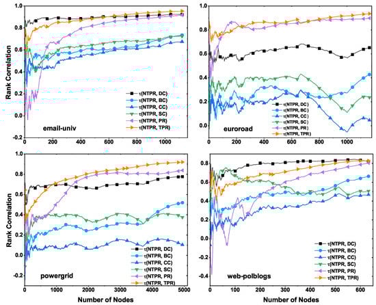 Table 3, we see that the NTPR measure is similar to PR for email-univ, euroroad, and powergrid datasets. We can also observe that NTPR is similar to DC for email-univ and web-polblogs datasets. This is because NTPR is an improved version of PageRank with degree centrality. The NTPR method does not have a close correlation with any of the other centralities. Degree centrality is primarily correlated with the NTPR measure at the initial set of vertices in the powergrid network and email-univ. Degree centrality is highly correlated with the NTPR method in the second half of set of vertices in the web-polblogs network. Thus, the NTPR measure does not closely correlate with existing basic centralities except PR and DC.