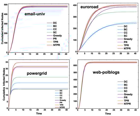 Figure 5. The proposed centrality NTPR gives more cumulative infected nodes than TRP, PR, SC, CC, BC, and DC in euroroad and powergrid networks. The NTPR gives better results than the greedy method in the powergrid and euroroad networks. For email-univ and web-polblogs networks, our method provides similar results to the existing centralities. In email-univ and web-polblogs networks, the NTPR and greedy model give good results. The four networks’ results are displayed in