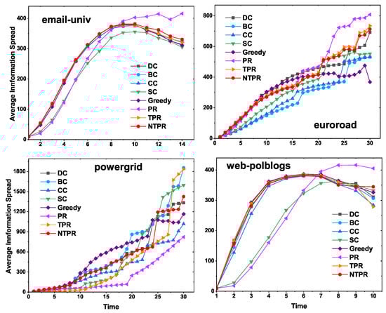 Figure 6, we show the average number of nodes at which information is received with different time steps by using the independent cascade model. The seed nodes were computed from different centrality measures which were input to the independent cascade model. In the independent cascade model, the number of iterations used for simulations was 1000. In email-univ and web-polblogs networks, the average information spread was greater at the initial steps for our centrality measure, and in the latter half, PR centrality dominated. However, NTPR and the greedy method both produced good results. The greedy method produced better results than basic centralities (DC, BC, CC, SC). In euroroad and powergrid, early on, our centrality measure produced good information spread, and in the second half of the time, greedy and PR performed well. In some cases, NTPR produced better average information spread than the other basic centrality measures with the independent cascade model. These results are shown in