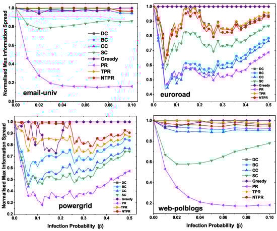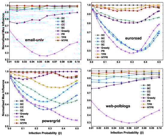 Figure 7, we illustrate the normalized maximum infection with various infection probabilities. On the dataset email-univ, our measure NTPR produced good results compared to PR, TPR, SC, CC, BC, and DC, as shown in