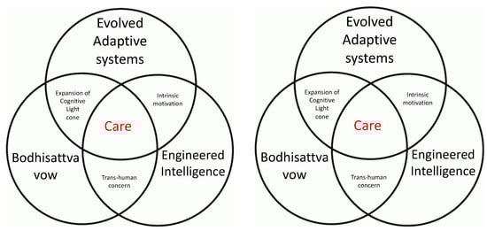 According to traditional Buddhist scriptural analyses, the recognition that there is no singular and enduring individual that must survive and prevail serves to undermine self-seeking action at the expense of others and their environment. Therefore, the evolving of intelligence that is aware of no-self—or if we want, intelligence that is no-self-aware—is also held to be intrinsically wholesome and associated with concern for the happiness and well-being of others. This claim—that simply understanding the irreality of enduring, singular agents can be a catalyst for ethically informed intelligence—is especially noticeable in Great Vehicle (Skt. Mahāyāna) currents of Buddhist view and practice that develop the idea of the Bodhisattva [26,27,117]. Traditionally conceived as an agent that has accepted responsibility for the flourishing of all sentient beings throughout time and space, a Bodhisattva pursues the attainment of “omniscience” (defined as unmediated and simultaneous knowledge of all things throughout space and time, both as they are and as they may seem to cognizing subjects) in order to protect and provide for all beings, and to assist them in achieving their own ultimate potential [118,119]. In this way, understanding of the drive of a Bodhisattva is two-fold: as affectionate care (concerned with sentient beings) and as insight into things as they are and as they appear (associated with the pursuit of omniscience). These two drives, care and insight, are seen as standing in a dynamic relationship and are not separate in essence. Hence, as a model of intelligence, the Bodhisattva principle may be subsumed under the slogan, “intelligence as care”.