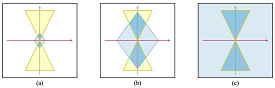 Care boundaries and physical light cones. Legend: Illustration of Care light cones (blue) and physical light cones (yellow). These illustrative plots of light cones represent Care, goals and inspirations in space (horizontal axis) and time (vertical axis) for different agents, represented by (a) a tick, (b) a human, and (c) an agent that has taken the Bodhisattva vow, for that specific agent at some specific time. The plots respond to similar conventions as Figure 4. The limited Care cones depicted in (a,b) contrast with (c), where the field of committed concern has become infinite (as shown by the pervasive blue tone).