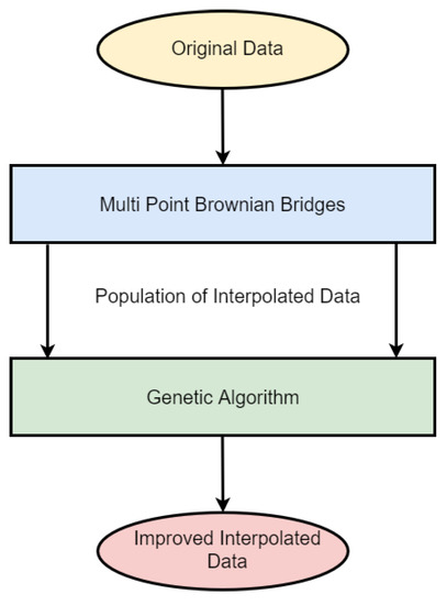 As depicted in Figure 1, the employed genetic algorithm is fueled by a population of stochastically-interpolated time series data, in our case multi-point fractional Brownian bridges. To generate these stochastically-interpolated time series data, multi-point fractional Brownian bridges [5] were used. An in-depth discussion and corresponding applications of regular fractional Brownian bridges are provided in [12,13].