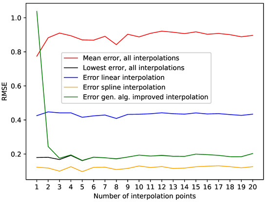 Thus, we obtain errors for the mean values of the initial population, for each time series in the initial population and the time series that was improved using the presented genetic algorithm. Furthermore, from all randomly generated interpolations, we select the one with the lowest RMSE to test it against the gen. alg. improved ones. Here, the root mean squared error , which is applied throughout this article, is given as: