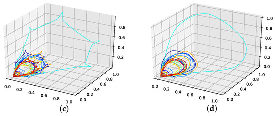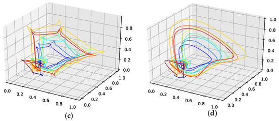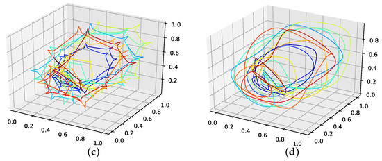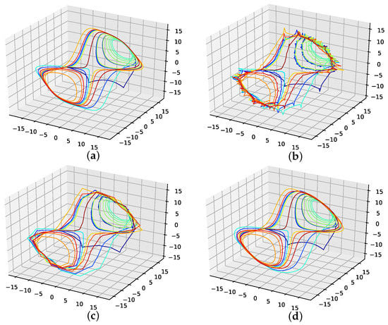 Reconstructed attractors for the interpolated Lorenz system for different loss functions. (a): Nearest neighbour distance loss function; (b): First derivative mean loss function; (c): First derivative variance loss function; (d): second derivative mean loss function.
