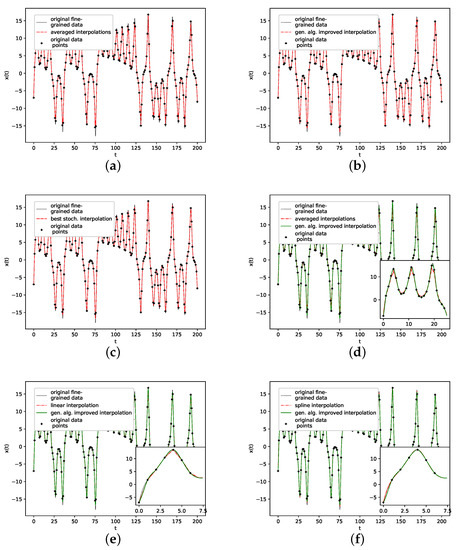 Original vs. interpolated time series data. (a): Non-interpolated original data (i.e., the one the error’s are calculated with) and population average; (b): Genetic-algorithm-improved interpolation; (c): The one interpolation of the population that has the lowest RMSE; (d): Population average vs. genetic-algorithm-improved interpolation; (e): Linear interpoaltion vs. genetic-algorithm-improved interpolation; (f): Spline interpolation vs. genetic-algorithm-improved interpolation.