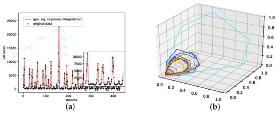 Interpolated data and reconstructed attractors for the car sales in Quebec data set. (a): The original and interpolated time series data; (b): Phase space reconstruction of the original data; (c): Phase space reconstruction of the average population data; (d): Phase space reconstruction of the genetic-algorithm-improved data.