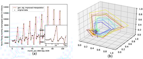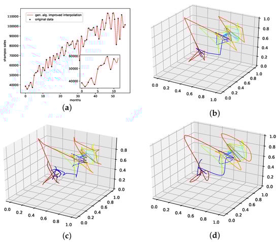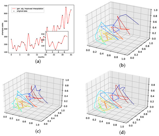 Interpolated data and reconstructed attractors for the Perrin Freres Champagne sales data set. (a): The original and interpolated time series data; (b): Phase space reconstruction of the original data; (c): Phase space reconstruction of the average population data; (d): Phase space reconstruction of the genetic-algorithm-improved data.