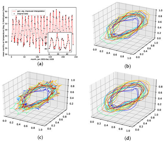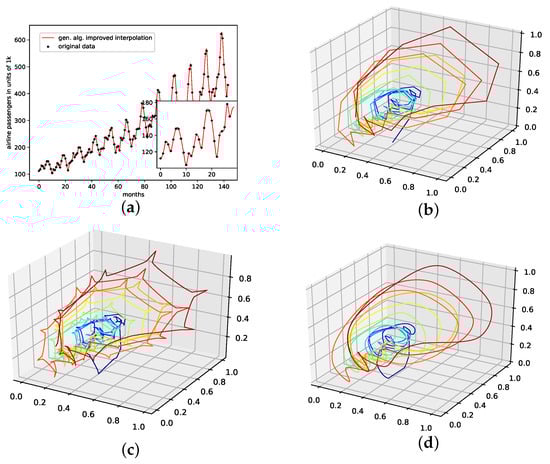 An interpolation of the original data set is depicted in Figure 6. Here Figure 6c,d present the population mean and the improved interpolation, respectively. When comparing them, one can see that the genetic algorithm improves the phase space portrait in terms of a smoothed-out phase space trajectory compared to the original time series (b) and the population mean (c), which are both pointy and have many sharp edges. When considering the actual time-series graph (a), the presented interpolation technique increases the major peaks, thus making extreme events more prominent. Further, it provides a rather smooth curve, i.e., no pointy edges, as depicted in the zoomed-in plot in (a).