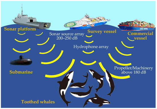 In the actual detection process, the passive sonar can still detect the LPD-based communication signal through a long-time integration. As the adversary approaches, the location of the communication equipment will be exposed. Moreover, since the signal transmitted by the LPD-based covert UAC method has obvious characteristics, the information is exposed, and the security is invalid once detected by the adversary. In addition, one finds that man-made noise can damage the sonar navigation system of cetaceans, which makes toothed whales unable to communicate, prey and identify directions, and even die in extreme cases [,,]. Figure 1 illustrates the effect of human activities on toothed whales.